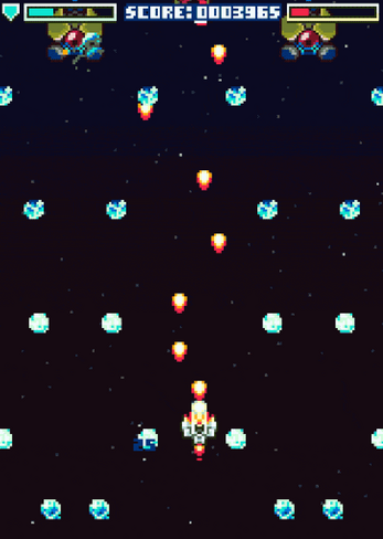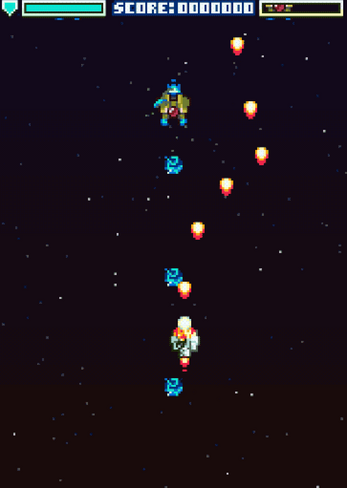 Tall vertical arcade cabinet style screen, excellent music and beautiful sprites. A big fan of the left and right tilted shots while wobbling about too. Mucho polished work.